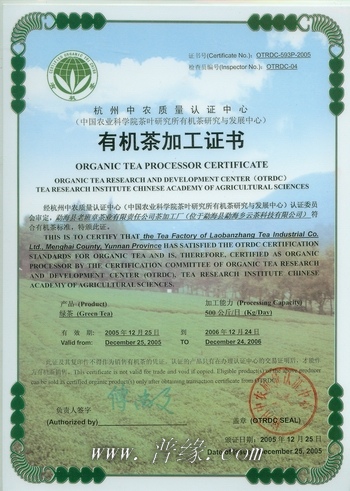 勐海县老班章茶业有限责任公司,2006年,有机茶加工证书
