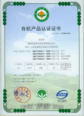 勐海县老班章茶业有限责任公司,2007年,有机产品认证证书